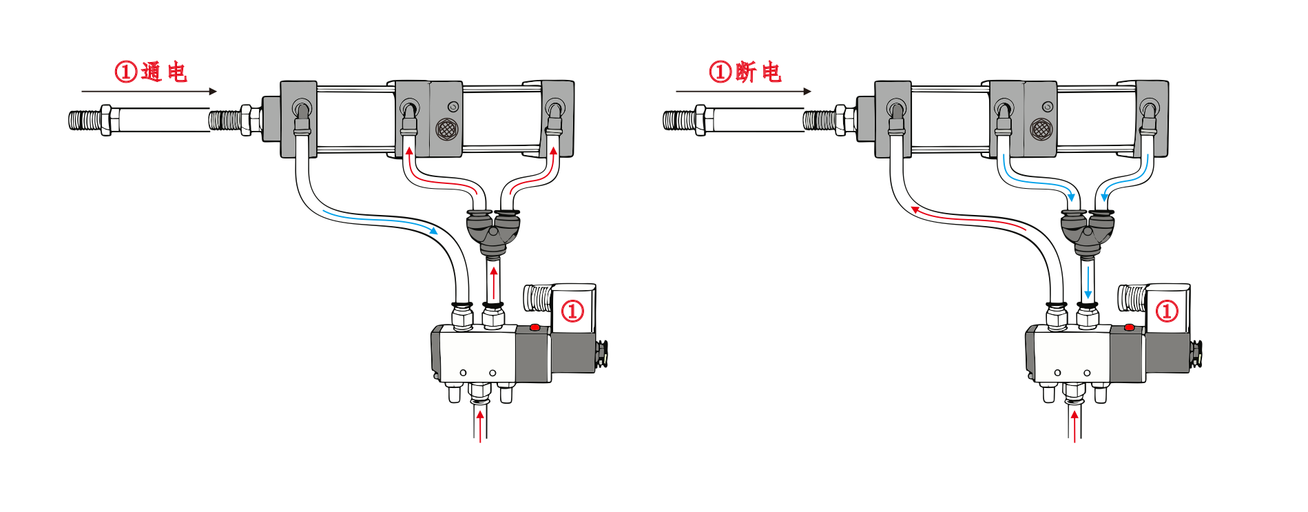 Magnetventil nr. 1 og nr. 2 er begge strømløse, og cylinderen trækkes helt tilbage.