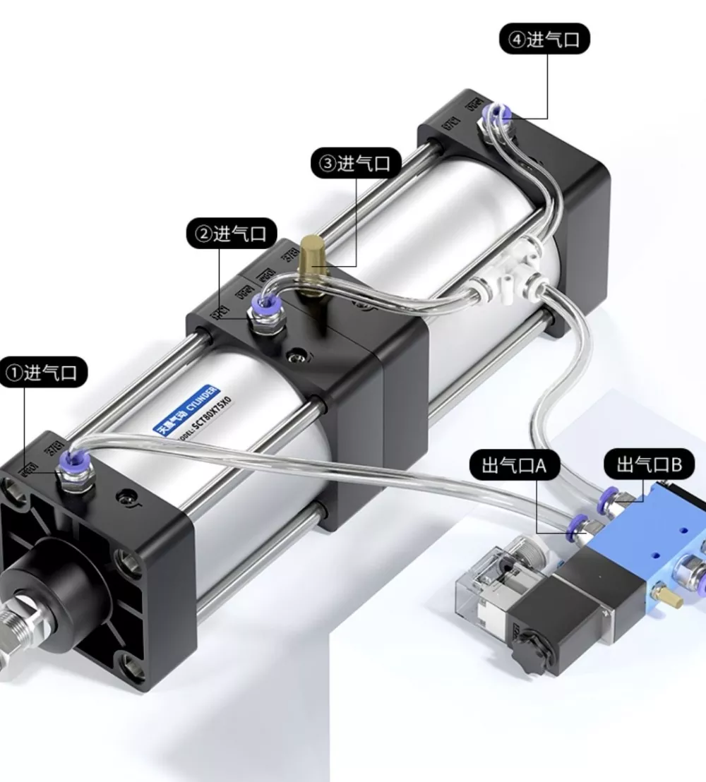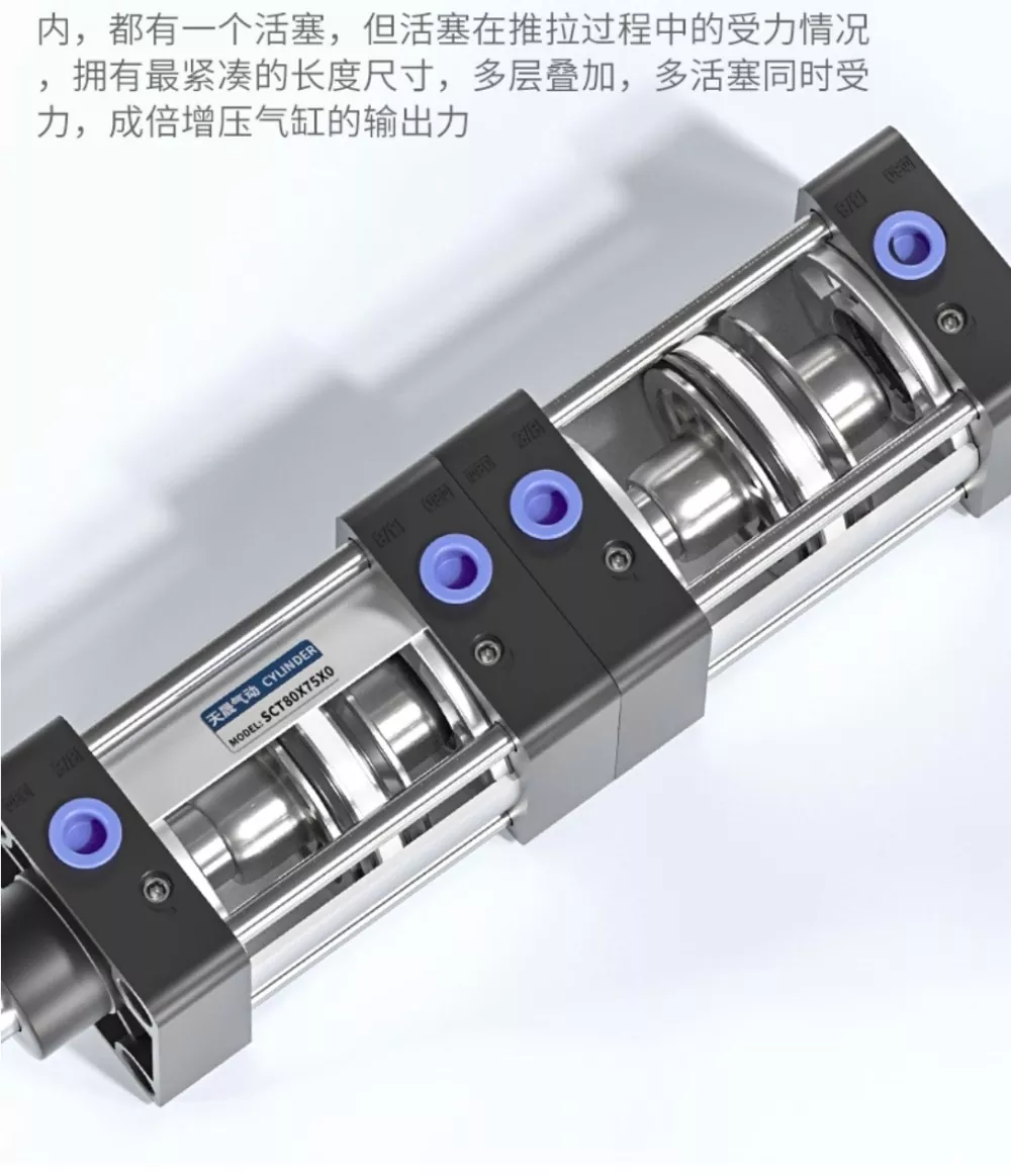 SCT-trækstangscylinderen har tovejs YCC-tætningsringe og et kraftfuldt dobbelttaktsdesign med et kompakt og raffineret udseende, der sikrer hurtig handling og jævnt, stabilt output. Hvert lag af cylinderen indeholder et individuelt stempel, og under push-pull-processen deler flere stempler belastningen, hvilket gør det muligt for cylinderen at opnå den mest kompakte længde, mens den genererer multipliceret udgangskraft gennem dens flerlags stablede struktur. Dette design med dobbelt kraft leverer stærkere kraft, og konfigurationen med seks tætningsringe giver fremragende tætningsydelse, hvilket gør det muligt for cylinderen at holde et tryk på op til 1,4 MPa uden lækage.